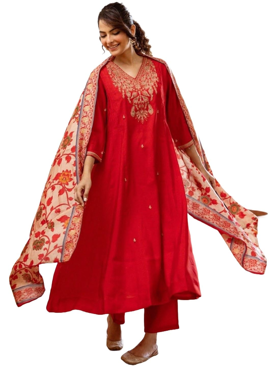 Womens Beautiful Chinon Embroidery Kurta Palazzo with Dupatta Readymade Salwar Suit Set Semi-Stitched Top Palazzo and Duppata for Wedding, Festival